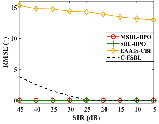 Figure 3 shows the RMSE of each method versus the SIR curve obtained by fixing the SNR and the number of snapshots N to −10 dB and 50, respectively. It can be observed that the performance of the MSBL-BPO is comparable to that of the SBL-BPO. They provide stable DOA estimates as the interference power increases since the interference is sufficiently suppressed by the MVDR-DL and cannot affect the DOA estimation. However, the performance of the C-FSBL is affected by strong interference, and its estimation precision decreases when SIR is smaller than −25 dB. The RMSEs of EAAIS-CBF are larger than in other methods. This is mainly because that the main lobe of the CBF is wide and only a peak exists in the sector [−14, −2]°, as shown in Figure 1c and Figure 2c. The peak out of the sector is mistaken for the target, leading to a large bias.