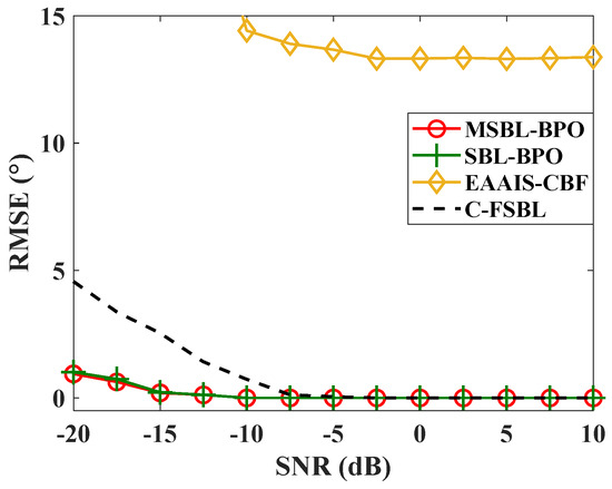 Figure 4 illustrates the RMSE of each method versus the SNR by fixing the SIR to −30 dB. Other parameters remain unchanged. The MSBL-BPO and the SBL-BPO use the MVDR-DL to suppress the interference, thus improving the signal-to-interference-and-noise ratio. Hence, they can be applied under lower SNR condition in comparison with other methods. Their RMSEs are lower than those of other methods when . The performance of the C-FSBL is worse than that of the proposed method, since it directly estimates the DOAs from the received data and ignores the interference. The existence of the interference affects its performance, especially in low SNR cases. Furthermore, the EAAIS-CBF has a wide main lobe, which leads to low resolution. Hence, it cannot provide DOA estimates for the targets.