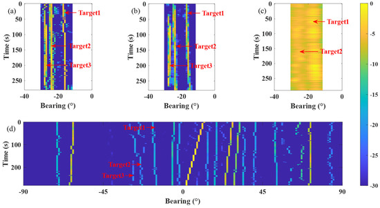 Figure 5 illustrates the DOA estimation result of each method. The MSBL-BPO and SBL-BPO use the MVDR-DL as preprocessor to sufficiently suppress the interferences, thus decreasing the influence of the interference on DOA estimation. They can estimate three weak targets well. In contrast, the performance of C-FSBL is affected by the interference, and it has some difficulties in resolving target2 and target3 from 120 s to 150 s. The EAAIS-CBF removes the interference subspace from the covariance matrix, thus preventing the interference from masking the targets to some degree. Unfortunately, the main lobe of its spatial spectrum is wide. Hence, it cannot resolve target2 and target3 due to the low resolution.