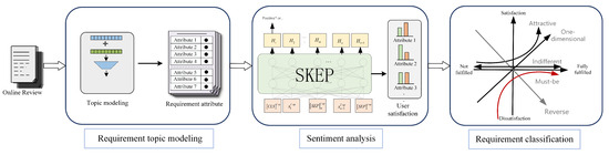 To effectively classify user requirements, it is essential to collect and analyze user feedback on the product efficiently. Traditional methods, such as surveys and focus groups, can be costly and time-consuming, and they may not adequately capture evolving user needs in the fast-paced world of product development [1]. Furthermore, the design of survey questions is primarily based on expert opinions, making it difficult to reflect some of the users’ true needs [2]. Therefore, classifying user requirements based on traditionally gathered opinions may not yield accurate results. With the rapid development of information technology and e-commerce, online user reviews, with their richness and timeliness, have become an important source of user opinions [3]. Utilizing text mining and natural language processing (NLP) techniques to assist in the study of user requirement classification from online product reviews has been proven effective [4]. The aforementioned studies generally involve three stages [5,6,7,8].