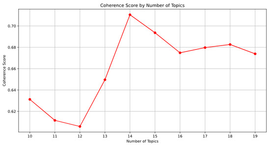 Drawing upon [39] and guided by an initial analysis of smartphone user requirements—which indicated a variety, exceeding ten distinct categories—we incorporated prior knowledge to guide the determination of the value of K for K-Means clustering in topic modeling. This preliminary assessment justifies our expectation that . Consequently, to identify the optimal number of clusters, we examined the coherence score () of the LDA model, as shown in Figure 4.