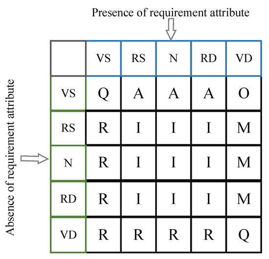 Here, the element in the matrix denotes the weight of of a specific Kano category C. A denotes the attractive requirement attribute, M denotes the must-be attribute, O denotes the one-dimensional attribute, R denotes the reverse attribute, I denotes the irrelevant attribute, and Q denotes the problematic attribute; the final weight of for a specific Kano category C is the accumulation of the elements of the matrix for the corresponding position. The classification of the requirement attribute under the final Kano model is the category corresponding to the value with the highest probability.
