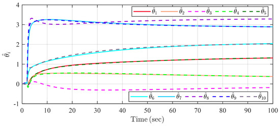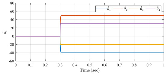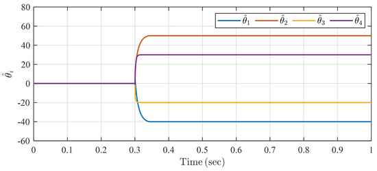 with , where denotes the white Gaussian noise, with power being . Select the predefined settling time as . The simulation result is shown in Figure 5 and Figure 6. Figure 5 indicates that the estimation of the four unknown parameters can converge to the neighborhood of their true values within T under the proposed identification algorithm. In Figure 6, the steady estimation errors, , are 1.5235, 1.0367, 0.2373, and 0.1052, respectively, for . The simulation results show the robustness of the proposed system identification algorithm to external disturbances and noise.
