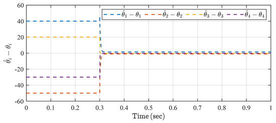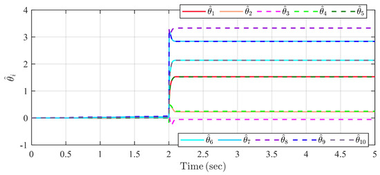 The simulation result is presented in Figure 2, Figure 3 and Figure 4. It can be seen that the estimation of unknown parameters, i.e., (), reaches the corresponding true values within the desired predefined times T in the three simulation cases. The four estimation errors are all less than in the three cases after the predefined settling times T ().