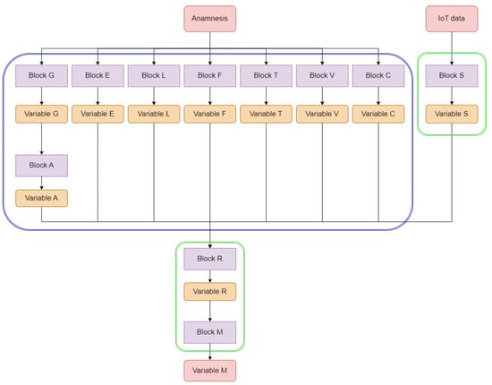 In its entirety, the knowledge base comprises 140 rules and 72 variables for input, intermediate, and output results. Given the specific decision-oriented nature of the rules and the designed structure of the ES, the distinction made for input data into dynamic and static classes is also reflected in the rules: out of 140 rules, 76 are dedicated to dynamic data processing and 64 to static data processing. The distinction is also visible in Figure 2: block S receives incoming dynamic inputs, which are then propagated down in the hierarchy through variable S to block R and, ultimately, block M. This allows for considering dynamic health-related IoT data along the entire reasoning chain, improving the ES’s ability to provide suitable monitoring intensity for the patient. Figure 2 highlights static blocks by encircling them in blue and the dynamic ones in green.