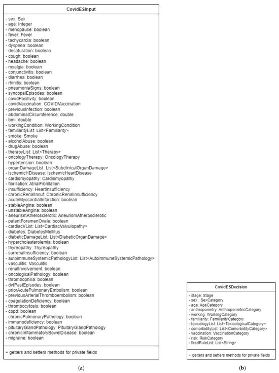 In addition, two custom classes were defined: one that is used to model the input of the ES and used as an input fact (i.e., the @Given-annotated object), and the other to represent the outcome of the system (i.e., the @Result-annotated field). The input class contains all the variables defined in Table 1, whereas the output class accommodates both the intermediate and output variables. Although the ES output consists solely of the chosen monitoring plan, for explanation purposes, the ES also provides information about the intermediate decisions taken and the list of rules activated during the facts evaluation. RuleBook supports such information propagation by exploiting the @Given and @Result objects, whose instances are passed through all the rules and their values can be updated as part of the action done when the rule is fired. A simplified class diagram of the input and output classes (CovidESInput and CovidESDecision, respectively) is shown in Figure 3.