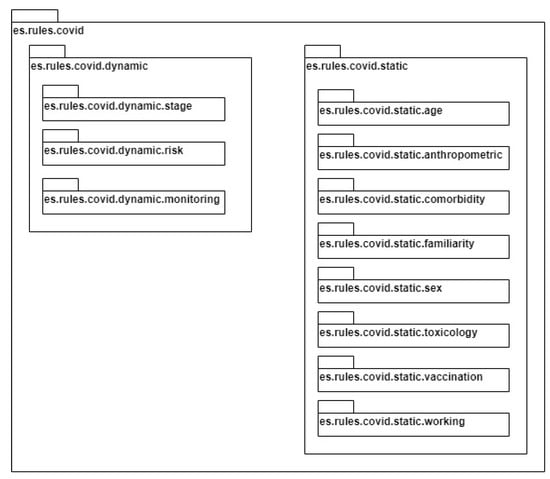 The implemented package organization also provides modularity to the expert system. Given the configuration policy through the package name, it is possible to make the system use only a subset of the complete rule base. As a result, in the case of the proposed ES, it enables configuring (and injecting into different components) multiple RuleBook objects, with each one taking decisions on a specific data category. It is therefore possible, for example, to store the decision taken on the static data categories (e.g., comorbidities, sex, age) and then re-evaluate only the dynamic portion of the rule set when new IoT data are received. This approach may also result in an overall scalability improvement.