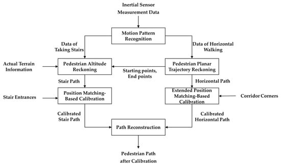 Figure 1 gives an overview of the proposed TFMC method, which includes motion pattern recognition (MPR), pedestrian planar trajectory reckoning (PPTR), pedestrian altitude reckoning (PAR), position matching-based calibration (PMC), and extended position matching-based calibration (EPMC). MPR is applied to divide the acceleration data into the data under the patterns of taking the stairs and horizontal walking. For the data of horizontal walking, PPTR is performed to recover the horizontal path. Then, the starting point and end point of each horizontal path are obtained. Note that between the end point of the previous horizontal path and the starting point of the next horizontal path is the stair path. Based on the data of taking the stairs, actual terrain information, and starting points and end points produced by PPTR, PAR is performed to recover the stair path. Subsequently, the stair path is calibrated by using the method of PMC with the position information of stair entrances. Similarly, the horizontal path is calibrated by using the method of EPMC with the position information of corridor corners. Finally, the calibrated stair path and horizontal path are combined to reconstruct the path, and the calibrated three-dimensional path is obtained.