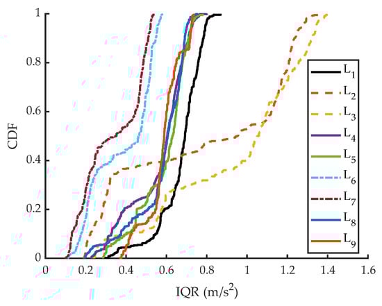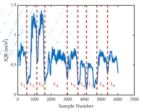 The interquartile range (IQR) is a statistical method used to measure the dispersion of data, which is robust against outliers or extreme values. It effectively mitigates the impact of extreme values in acceleration data. Therefore, the IQR is utilized to process the acceleration data [36]. The window size of accelerometer signals is set as 100, and the data of the series are arranged in descending order. The calculation formula of the IQR is as follows:
