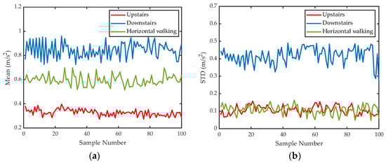 where is the sample data, is the sample average, and N denotes the sample number. As depicted in Figure 4, acceleration data for the three motion patterns were collected utilizing an inertial sensor, comprising 100 groups for each pattern.