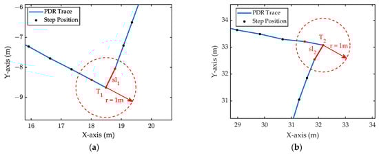 Taking the turning point as the center of the circle, a circle with a radius of one meter is made, and the area inside the circle is the turning area. If the step position is in the turning area, it will be deleted. As illustrated in Figure 6, T1 and T2 are two adjacent turning points. Between T1 and T2, their corresponding deleted step lengths are sl1 and sl2, respectively.