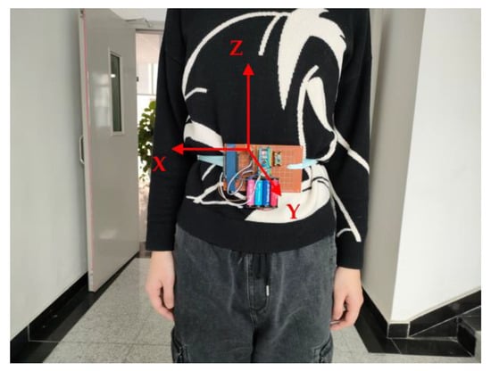 As illustrated in Figure 8, the MPU-6050 device produced by InvenSense Company (San Jose, CA, USA) is worn on the tester’s waist, close to the abdomen, and includes an accelerometer and a three-axis gyroscope. The linear acceleration in the vertical direction and yaw angle data are collected at a sampling rate of 50 Hz.