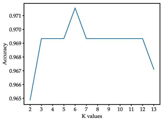 The KNN algorithm is performed for motion pattern recognition. The sample dataset is randomly split into training and test sets in a 7:3 ratio, which is subsequently standardized. In order to make the model more accurate and reliable, 10 folds are chosen for cross-validation. Additionally, in the KNN algorithm, a small value of K can be sensitive to outliers, while a large value of K can be affected by sample imbalance. A grid search is conducted for values of K from 2 to 13. As shown in Figure 9, the algorithm achieves the highest accuracy when K is set to 6.
