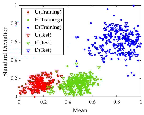 As shown in Figure 10, the training set and the test set after KNN classification are presented. In this feature space composed of two characteristic variables, the feature points of the three motion patterns are widely dispersed, which means significant distinguishability.