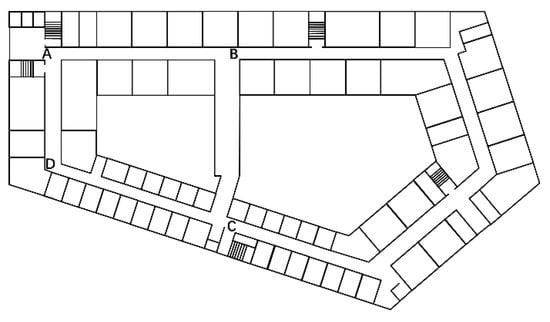 Experiments were conducted in buildings featuring stairs and corner corridors. The architectural layout of the building is depicted in Figure 11. For the purpose of replicating experiments, two specific sites were chosen: