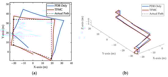 After MPR and PMC, the inertial navigation positioning calibration results were acquired. The calibrated indoor walking path is shown in Figure 12. Through terrain feature matching, the stair path underwent stair feature point position calibration, while the horizontal walking path underwent calibration of the corridor turning point position, step length, and yaw. The results shown in Figure 12b can verify the feasibility of the proposed method for 3D positioning. The path trajectory after terrain feature matching calibration closely corresponds to the actual walking path.