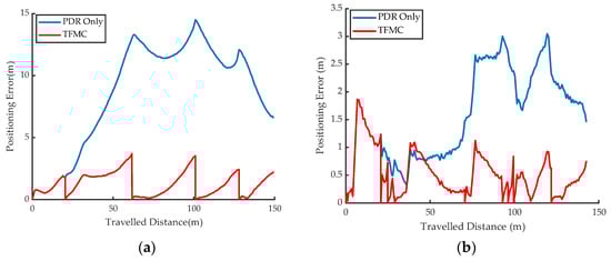 Figure 13 shows the variation of the positioning error with the walking distance before and after the TFMC. Before the TFMC, the PDR positioning error noticeably accumulates with time. The positioning error is significantly reduced at each feature point by using the TFMC. The improvement in positioning performance is attributed to the combined effect of position calibration, step length calibration, and yaw calibration for the horizontal walking path, along with position calibration for walking on stair paths.