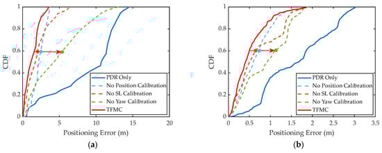 In Figure 14, the cumulative distribution function (CDF) of the positioning error is presented for cases where a single calibration measure is omitted. It shows that the TFMC method keeps 90% of the 2D positioning error within 2.5 m, while 90% of the 3D positioning error is kept within 1 m. For the purpose of measuring the attenuation of the positioning performance by the omission of different calibration measures, in the graph, a horizontal line is made by the point of the curve corresponding to TFMC to intersect with other curves. Based on the distance between the intersection and the starting point, it can be concluded that yaw calibration yields the most influential improvement in positioning performance, while the improvements brought about by position calibration and step length calibration are relatively modest and have similar effects.