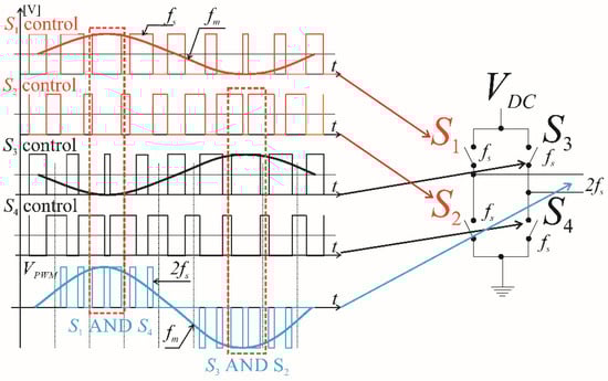 Figure 2 presents the idea of the so-called 1-scheme of 3-level modulation [31]. The upper H-bridge transistors of both bridge legs (S1 and S3) are driven with the pulse series shifted with half of the fundamental period. Both waveforms are sinusoidal summed with a constant value equal to half of their amplitude. The characteristic feature of this PWM scheme is the double switching frequency 2fs in the output.