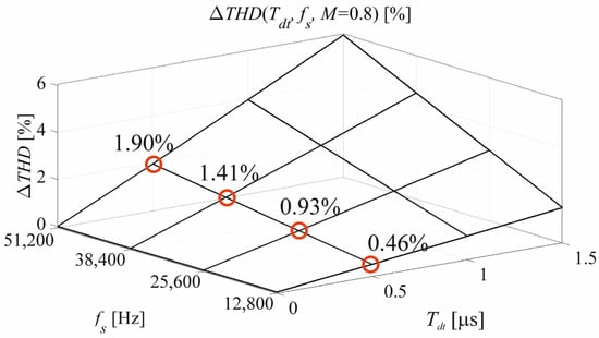 The DC serial resistance of the filter coil (with Super-MSS core [37]) is 0.2 Ω but the power losses [39] cause its increase for the AC magnetising current (with fs’ switching frequency) [38]. A serial equivalent resistance for the used switching frequencies was assumed, for the load current range RL = 1 Ω. The used drivers introduced 0.5 μs of dead time Tdt. Dead time decreases the PWM pulse width by the constant value. It makes the short pulses vanish. For the 3-level PWM, the absolute value of the output voltage is decreased when the output current changes its sign. This effect increases the output voltage distortion (total harmonic distortion THD) proportionally to the switching frequency for the simulated PWM voltage. THD is calculated to the 15 harmonics (750 Hz) because it will be the resonant frequency of the output LC filter. It is presented in Figure 3 for the modulation index M = 0.8, neglecting the output filter impact. With Tdt = 0.5 μs, for fs = 12,800 Hz, ΔTHD = 0.46%; for fs = 25,600 Hz, ΔTHD = 0.93%; and for fs = 51,200 Hz, ΔTHD = 1.90%. There are some solutions to decrease the influence of dead time, e.g., properly shaping the reference voltage but this is not a subject of this paper. The higher the switching frequency, the higher the additional distortions.