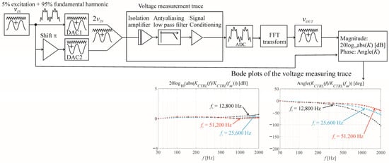 There are two current and one voltage measuring traces. All of them have similar designs except the input. The fast transducers are in the current traces and the isolation amplifier is in the voltage trace. In the measured frequency range of 50–5000 Hz, their frequency-dependent characteristics do not notably make a difference in the whole-trace Bode plots. As a result, Bode plots of one voltage measuring channel will be shown. The idea of measuring Bode plots of the voltage channel in the VSI is shown in Figure 4. In the experimental VSI, the PWM signal and this signal shifted with half of the fundamental period are driving two digital-to-analogue converters (internal DAC1 and DAC2 from STM32F407VG), and the difference between their outputs was connected to the input of the voltage measuring trace. The output signal of the trace was measured. There are different units for the input signal, volts, and the output measured using analogue-to-digital converter ADC, units of the 13-bit converter (12-bits and the sign, −4095 to 4095). As a result, it is not possible to compare the output signal in units and the input signal in volts. The solution presented in [40] for measuring the real parameters of VSI is the “relative” way of measuring. The quotient of the ratios of excitation and the fundamental waveform in the output and input were measured (Figure 4). The assumption was that the fundamental waveform was not suppressed or shifted. However, in this way, it is not possible to measure the “proportional gain” (Figure 5). In the real VSI, this gain was adjusted to get the amplitude of the measured signal to about ¾ of the full scale of the ADC for the nominal load. Adjusting the channel gain is called scaling and is described in [41].