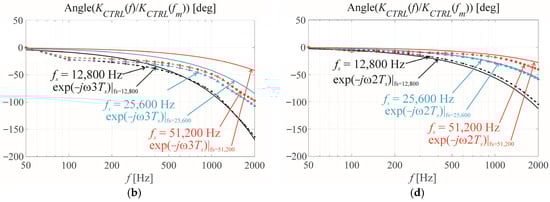 Finally, it was shown in Figure 5 that for the low and middle switching frequencies (fs = 12,800 Hz and fs = 25,600 Hz), the Bode plots in the frequency range below 1000 Hz can be approximated by the simple delay exp(−jωnTs), where n = 2 or 3. This demonstrates that the Bode plots in this frequency range depend much more on the digital signal processing in the microprocessor than on the analogue properties of the measuring channel.