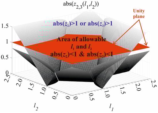 Figure 7 presents the area in which (25) is filled for z2 and z3 using (28) for fs =12,800 Hz, LF = 1 mH and CF = 51 μF.