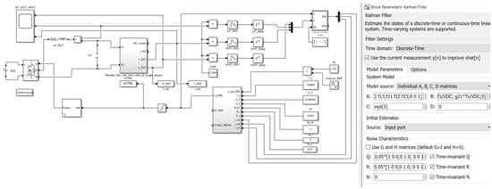 The MATLAB/Simulink model of the low switching frequency VSI with prediction with the linear Kalman filter. The Q, R and N matrixes of the Kalman filter and the VSI discrete model matrixes A, B and C are in the right side of the figure.