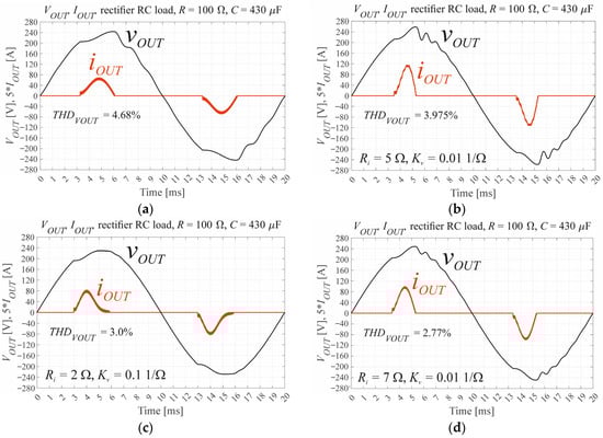 In both approaches of modelling, (1) and (2), the load resistance RLOAD is a model component. It means that the inverter model depends on the load. The solution is to measure the load current and treat it as an independent disturbance or the state variable [8,9,10,11,12,13]. The disadvantage of such a solution is losing the dependence between the output voltage and the output current. However, it is the most commonly used approach to inverter modelling.