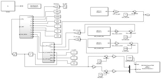 The presented problem of PBC control for the low switching frequency was experimentally checked. The example of control for the high switching frequency (51,200 Hz) where no prediction was necessary was presented in [17]. In all the cases, the maximum (without oscillations) gains Ri and Kv were set after initial adjustment based on Figure 6. It was noticed that the area of the stable operation is as in Figure 6 but the voltage gain Kv requires additional restriction. The fastest way to conduct the experimental verification was to use the Real Time Interface for MATLAB/Simulink 2021b, e.g., RTI1202 MicroLabBox with dSpace libraries for Simulink [17,41]. Scaling the gain of the measurement traces is a very important but often neglected problem [41]. In the case of RTI1202, it is easy to use dSpace Control Panel 7.5. For the open loop, for the nominal output voltage and the assigned resistive load, we set the gains in Simulink to get equal amplitude values for all of the voltage and current waveforms. Further, both current values were divided by the value of the existing resistive load (Figure 11). Each of the 3 independent ADCs were triggered by PWM events. The first ADC channel 1 interruption, when data are ready, calls the whole function block, which is seen in Figure 11. The PBC controller directly realises control laws (14) and (15). The predictor from Figure 11 realises Equation (19). The modulation scheme is from Figure 2. The compiled file is transmitted to MicroLabBox which measures the output voltage, output current and inductor current signals and drives two legs of the H-bridge described in Section 2.3.