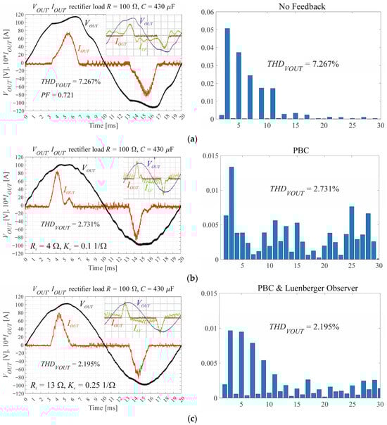The VSI output voltage and current for fs = 12,800 Hz, RL = 1 Ω, LF = 1 mH, CF = 51 μF, rectifier load R = 100 Ω, C = 430 μF, (a) for the open loop, (b) for PBC controller without prediction and (c) for PBC controller with prediction.