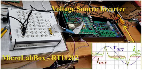 The experimental VSI output voltage and harmonics spectrum without control (Figure 12a), with PBC control without prediction (Figure 12b) and with PBC control and prediction with the full state Luenberger observer (Figure 12c) are presented. The gains Ri and Kv for the PBC controller without predictor were adjusted to 4 and 0.1, respectively, to get the lowest distortion of the output voltage without oscillations. The higher values of the gains caused output voltage oscillations. For the system with a predictor, it was possible to increase the gains Ri and Kv to 13 and 0.25, respectively, without oscillations. The Luenberger observer l1, l2 and l3 gains were set to 1, 1 and 0.5, respectively. The laboratory VSI controlled with the MicroLabBox is shown in Figure 13.