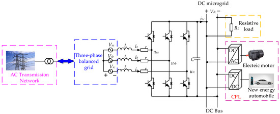 As commonly used powerful electronic devices, three-phase PWM rectifiers are extensively employed in DC microgrids (MG) [1,2]. Figure 1 illustrates the three-phase PWM rectifier’s function as a crucial interface between the power grid and the DC MG. Its primary function is to maintain a constant DC bus voltage under resistive and power load conditions [2]. However, the CPL possesses a negative impedance property, which imposes stricter requirements on the control performance of the three-phase PWM rectifier [3]. Therefore, designing controllers for three-phase PWM rectifiers has become a research hotspot in the field of MG. Currently, control strategies for three-phase PWM rectifiers are mainly classified into voltage-oriented control (VOC) and direct power control (DPC). VOC can achieve a fast dynamic response and high-precision steady-state performance. However, its dynamic response is susceptible to the performance of the internal current loop and the phase-locked loop [4,5]. The DPC method takes the active and reactive power on the grid side as the object to be controlled and effectively overcomes this problem by eliminating the need for both the phase-locked loop and the current loop [6]. Additionally, compared to the VOC, the DPC exhibits a higher power factor, lower total harmonic distortion (THD), better dynamic response, and stronger robustness. As a result, DPC has attracted widespread attention from scholars [7,8,9].