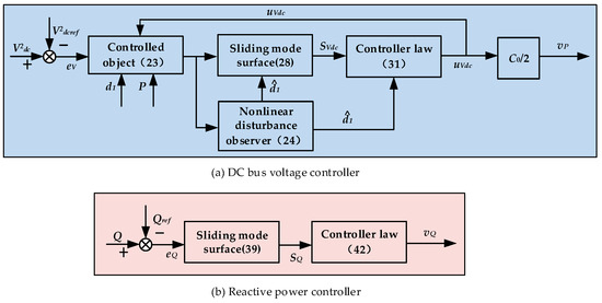 Figure 2 illustrates the proposed robust direct power control strategy for the three-phase rectifier shown in Figure 1. As explained in Section 3.2, the active and reactive power controllers are designed separately since P and Q are uncoupled. The DC-side power model and active power model are treated as a unified system and controlled using the SMC with the NDO (SMC + NDO) method to regulate Vdc, as shown in Figure 2a. The sliding-mode controller is used to control the reactive power, as shown in Figure 2b. The following section will explain the process of designing controllers.
