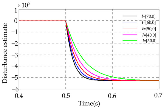 Figure 6. Disturbance estimate under different values of l. - The criterion for the rectification of the SMC parameter cvdc: First, cvdc is chosen to be within the defined range (cvdc > 0). Second, as shown in Figure 7, a larger cvdc results in faster convergence and smaller voltage drop. However, a larger cvdc will lead to a larger switching gain kVdc, as defined in Equation (32), which increases the chattering. Furthermore, when cvdc exceeds 30, the improvement in dynamic performance shown in Figure 7 is not significant, so we set cvdc value to 30;