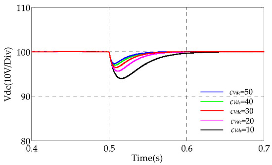 Combining Assumption 1 and Lemma 1(2), it is known that the system states satisfy and . That means that and ultimately converge to d1 and Vdcref2, respectively. From (28), it follows that when the system reaches the sliding-mode surface, there is , and then there is . This implies that the proposed SMC + NDO only requires one controller to regulate both DC bus voltage and active power. Furthermore, it suggests that the proposed SMC + NDO not only simplifies the control design but also improves robustness to both matched and mismatched power disturbances. According to (32), the proposed SMC + NDO can greatly reduce kVdc, and sliding-mode chattering is also effectively decreased consequently.