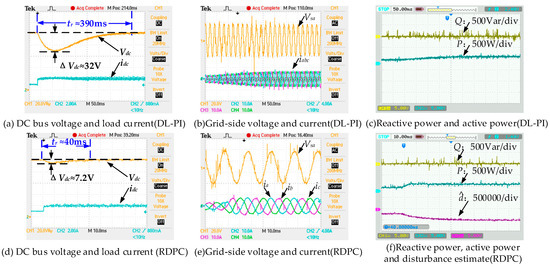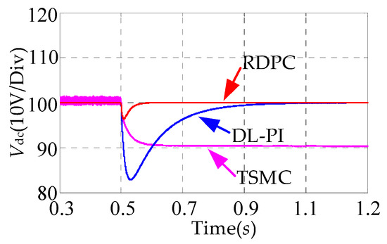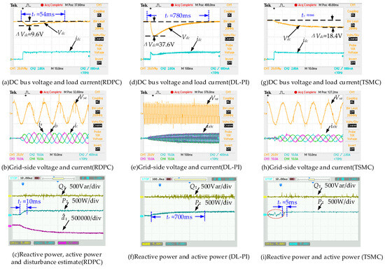 In this case, the load changes from no load to a load composed of a resistor of 50 Ω. Figure 8 and Figure 9 show the transient response of the DC bus voltage under three control methods; the general trends of the experimental waveforms are consistent with the simulated waveforms. In Figure 8 and Figure 9, one can observe that both the DL-PI control and the RDPC can regulate the DC bus voltage to the desired value of 100 V. However, the RDPC exhibits superior dynamic performance with a shorter transition time tr and less of a DC bus voltage drop ΔVdc. The reason is that the RDPC can compensate for disturbances in real time through the NDO, which enhances the resistance to mismatched disturbances. The TSMC is unable to completely suppress mismatched disturbances. Consequently, when the load is 50 Ω, the DC bus voltage does not reach 100 V, as depicted in Figure 8 and Figure 9. In contrast, the RDPC achieves simultaneous the regulation of DC bus voltage and active power through a single-loop control structure. On the other hand, the inner loop (current loop) in the DL-PI control is equivalent to a first-order inertial element, which causes a certain control delay. As a result, the dynamical response of the DL-PI is slower than that of the RDPC with a single-loop control structure.