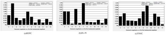 Figure 9b,e,h show the steady-state current waveforms with the DL-PI, TSMC, and the RDPC. Figure 10 presents the power factor (PF), the total harmonic distortion (THD), and the current spectrum for the a-phase current. Comparing PF and current spectrum in Figure 10a–c, the RDPC has a better performance. Notably, the fifth and seventh harmonics are reduced compared to the DL-PI. The THD values for DL-PI are 4.023% (ia), 4.007% (ib), and 4.062% (ic). The THD values for TSMC are 6.717% (ia), 6.037% (ib), and 6.642% (ic), while the THD for the RDPC are 3.422% (ia), 3.207% (ib), and 2.799% (ic). The reason for this difference is that the RDPC considers the DC bus voltage and active power as a whole and applies the Lyapunov stability theory to design the controller, ensuring good stability over the whole load range. Meanwhile, it can be observed that the TSMC and RDPC have the same single-loop control structure, but the THD of the TSMC is higher than that of the RDPC. This is because the TSMC requires a large switching gain kp to suppress the mismatched disturbances, and a large switching gain kp can cause severe chattering, which leads to current distortion.