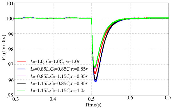 This section proves the robustness of the proposed RDPC scheme against parameter uncertainties. To evaluate the robustness against the parameter uncertainties, the values of L0, C0, and r0 are set in variations. It is important to note that we have changed the parameters in the control system to evaluate the robustness of the control, as this method avoids the degradation of filtering performance due to physical changes in an L filter and C filter [36]. Figure 11 and Figure 12 show the simulation and experimental results with the parameter uncertainties. Table 3 summarizes transient and steady performances under these uncertainties. The results indicate that the current THD, DC bus voltage drop, and transient time have not changed significantly, confirming the strong robustness of the RDPC for parameter uncertainties.