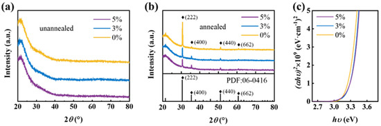 Figure 1a displays the XRD patterns in θ-2θ scans of 50 nm-thick unannealed In2O3 films with varying R[H2]. The XRD spectra of as-deposited In2O3 films presented low diffraction intensity and rather broad background, indicating that the as-deposited films produced through magnetron sputtering are amorphous. After annealing in air at 350 °C for 1 h, all the films turn to the polycrystalline state; as observed in Figure 1b, there are four clear characteristic peaks which correspond to the (222), (400), (440), and (622) crystal planes [22]. These observed diffraction lines agree well with the cubic bixbyite indium oxide structure (JCPDS06-0416) and Ia-3 space group (Number: 206). Calculated with Scherrer’s formula on the reflection (222), the grain sizes of the In2O3 films with 0%, 3%, and 5% hydrogen content are determined to be 50.6 nm, 48.2 nm, and 49.5 nm, respectively. Interestingly, as R[H2] increases, the intensity of the (222) peak gradually lowers. These results indicate that the introduction of H in In2O3 does not promote grain growth, while it even more or less suppresses the crystallinity [23]. It is worth mentioning that these observations diverge from existing reports on H-doped In2O3 [21], which may be attributed to the discrepancy in the phases of the as-deposited In2O3 films: polycrystalline in the literature and amorphous in this work.