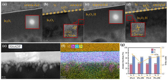 Cross-sectional HR-TEM images (a) 0%-0, (b) 0%-350, (c) 5%-0, (d) 5%-350. The insets to (a,c) show the Fast Fourier Transformed images of the as-deposited films. (e) HAADF image and (f) EDS mapping results of the annealed In2O3:H films at R[H2] = 5%. (g) Atomic fractions of In, O, and the O/In radios in as-deposited and annealed In2O3 and In2O3:H films obtained from EDS analysis.