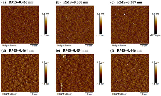 AFM images and root mean square roughness RMS (a) 0%-0, (b) 3%-0, (c) 5%-0, (d) 0%-350, (e) 3%-350, (f) 5%-350.