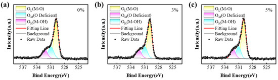 The XPS O 1s spectroscopic analysis of In2O3 etching films at a depth of 20 nm with different R[H2]: (a) R[H2] = 0%; (b) R[H2] = 3%; (c) R[H2] = 5%.