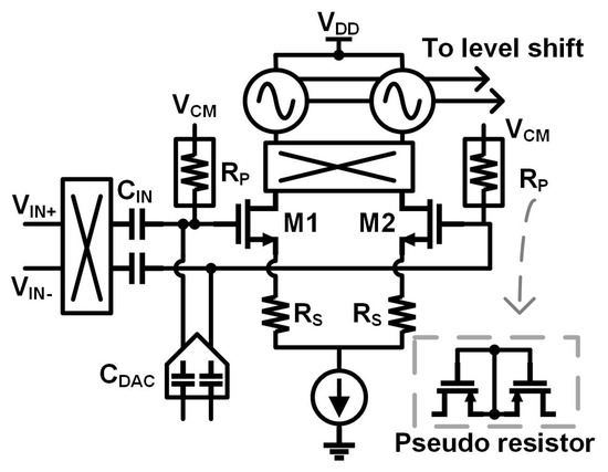 The linearity of the V/I conversion is enhanced by employing the source degeneration structure. To achieve current multiplexing and improve the current efficiency, the V/I conversion circuit is stacked with 16 pairs of CCOs. The frequency range of the EEG signal distribution is typically 0.5–100 Hz, which requires the high-pass filter (HPF) cutoff frequency composed of the input capacitor and the bias resistor to be below 0.5 Hz. To achieve resistance of tens of G, the input of the V/I conversion is biased by a pseudo-resistance composed of an MOS transistor. The amplitude of the summed input at the input terminal of the V/I circuit is kept within 10 mV by adjusting the feedback coefficient. This approach not only ensures that the MOS transistors remain in saturation but also minimizes the input swing, thereby maintaining the pseudo-resistor at a high level and effectively reducing the impact of noise originating from the pseudo-resistor. To avoid a gate leakage current, thick oxide transistors are used for the differential pairs M1 and M2. Furthermore, chopper techniques are used to reduce the IRN.
