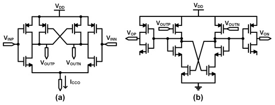 Figure 4a shows the implementation of the CCO circuit, where each delay cell comprises an inverter pair and two cross-coupled PMOS transistors, effectively reducing flicker noise. Regarding the phase noise of VCO, it is negligible when equivalent to the input. Due to the CCOs being stacked on the differential pair, the output waveform amplitude remains relatively small. Therefore, a level shifter is required to achieve a rail-to-rail output waveform, as shown in Figure 4b.