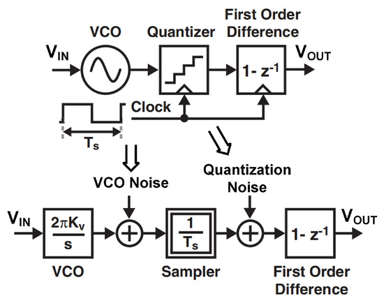 Firstly, an analysis of the first-order linear model for a VCO-based ADC is conducted. In Figure 5, the upper part is the functional block diagram of a VCO quantizer, while the lower part corresponds to its linearized frequency domain model. The VCO module, corresponding to the VI and CCO, performs voltage-to-current and current-to-frequency conversions on the input VIN signal, respectively. The quantizer module, represented by a set of registers, is responsible for sampling and quantizing the phase signal output from the VCO.