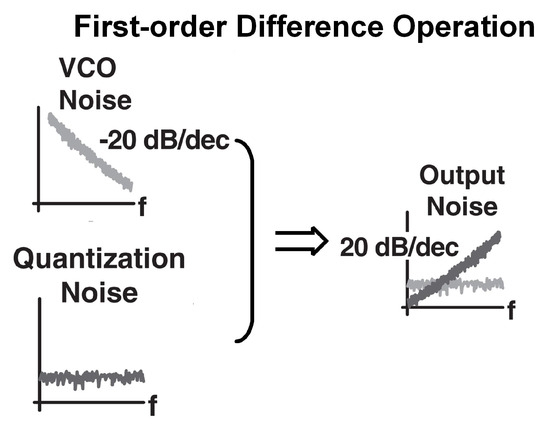 As shown in Figure 6, the quantization noise first undergoes first-order noise shaping through the differencing operation depicted in the diagram. It is also observable that the VCO’s phase noise undergoes shaping. However, due to the original phase noise signal possessing a slope of −20 dB/dec, the result of the shaping is a flat spectrum. In practical scenarios, the shaped VCO phase noise would also contain 1/f noise, but, for the sake of the following analysis, this aspect is temporarily simplified.