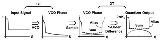 By comparing the reconstructed input signal (in dark lines) with a copy of the aliased signal (in lighter lines) through the output of the VCO quantizer, it can be observed that the VCO-based quantizer inherently functions as a first-order anti-aliasing filter. Although the structure of this first-order anti-aliasing filter is simple, its effectiveness in suppressing the aliased signal is roughly equivalent to 20 log (/).