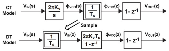 To construct the DT model, first replace the gain of the CT-VCO, 2/s, with the gain formula for the DT-VCO, 2/(1 − , and move the gain of the sampler, 1/, in front of the VCO quantizer, as shown in Figure 8. For low-frequency input signals, the VCO quantizer is approximated as a single module with a gain (z), which converts the input voltage (z) into the frequency at VCO output (z):
