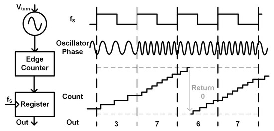 As shown in Figure 9, different input voltages result in varying oscillation frequencies in the VCO. The output waveform of the VCO is sampled by an edge counter after level shifting and stored in a set of registers (DFFs) at a sampling frequency . In this design, the edge counter operates in a cyclic manner without the need for resetting and provides the output as the difference between two consecutive register values. The purpose of this approach is to preserve the truncation error q[n] that occurs at the end of each clock cycle, allowing it to accumulate in the next cycle. If the accumulated quantization error exceeds one LSB, an additional output is generated. This ensures that the quantization error between samples remains within one LSB.
